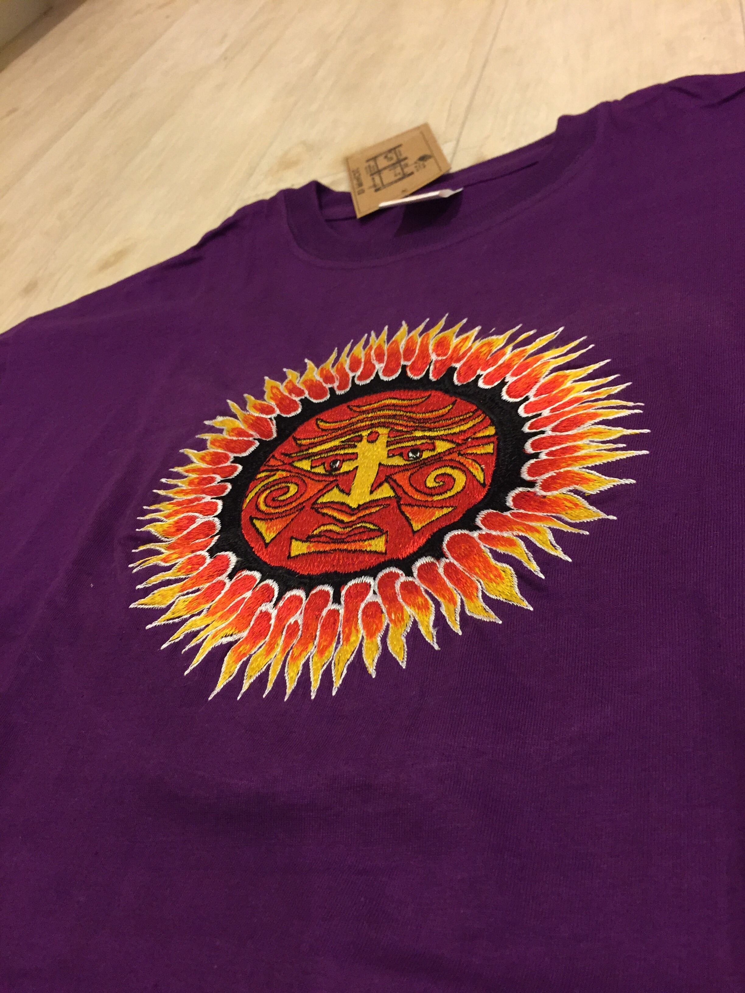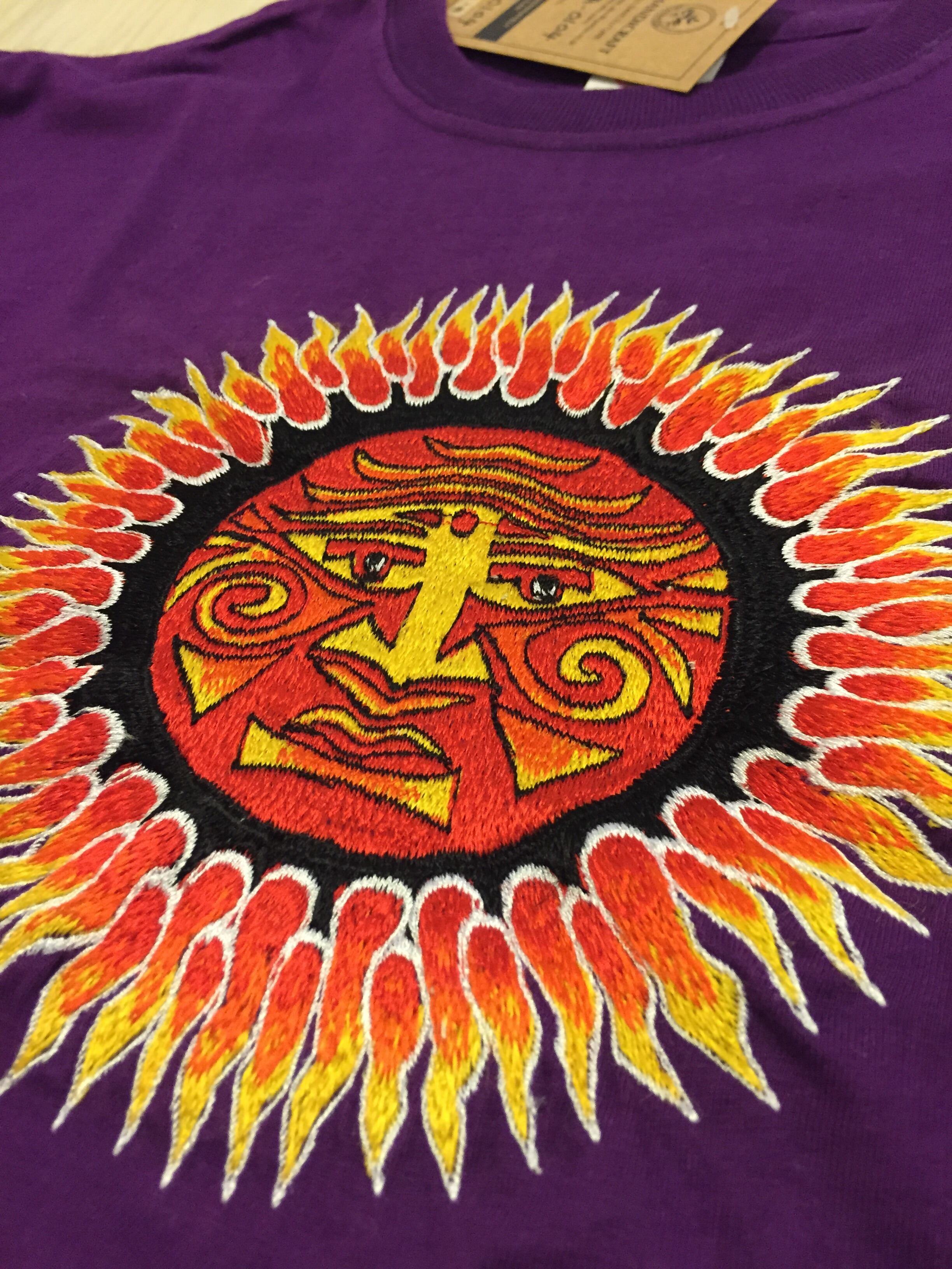 胸元の太陽は手縫いの一点モノ。